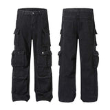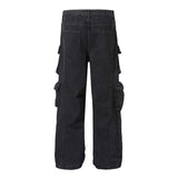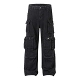 These black trousers feature a mid waist and zipper fly design. Made from cotton, they have a loose fit with a straight-leg style, ideal for everyday wear by men.