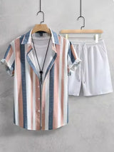 This casual summer outfit for men features a short-sleeve shirt paired with comfortable shorts, perfect for leisure and everyday wear. Made from a cotton blend with polyester fiber, it is lightweight and breathable. Available in seven color options, this set combines style and comfort for casual outings.