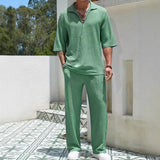 This casual outfit for men features a short-sleeve shirt paired with trousers, perfect for everyday wear. Made from polyester fiber, it is lightweight and comfortable. Available in black, royal blue, gray, green, blue, and khaki, this set offers a stylish and versatile look for casual or leisure occasions.