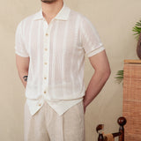 This shirt is made from 100% cotton, offering a lightweight and breathable feel perfect for warm weather. It features a stylish lapel collar and short sleeves, combining comfort with a casual yet refined look. Available in creamy-white, black, and brown, this shirt comes in sizes from M to 3XL, accommodating a variety of fits. Ideal for everyday wear, it blends classic design with practical comfort.