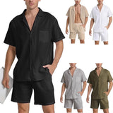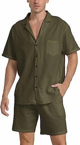 This casual set for men includes a top and matching pants, made from flax for a soft and breathable feel. Available in black, white, gray, khaki, and army green, it is perfect for daily casual wear or leisure activities.